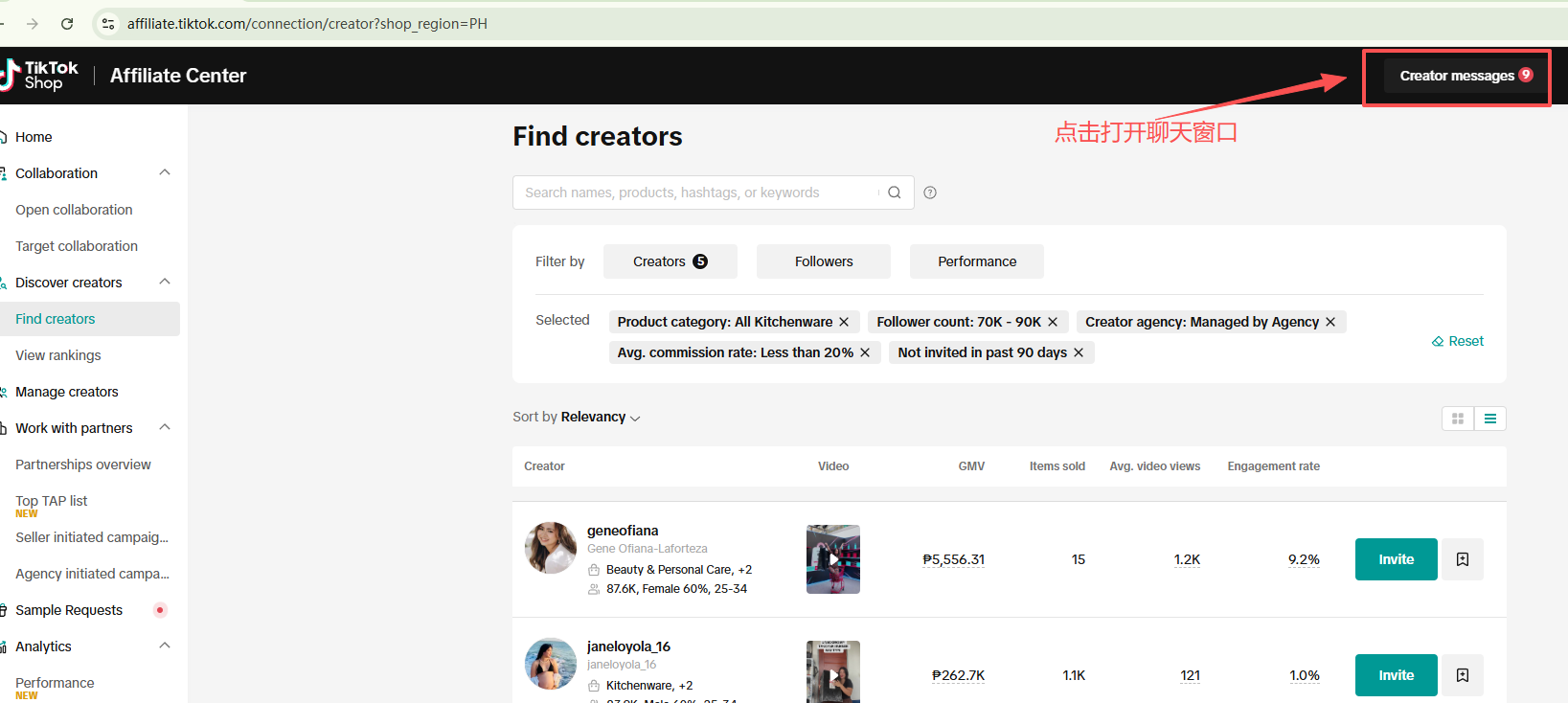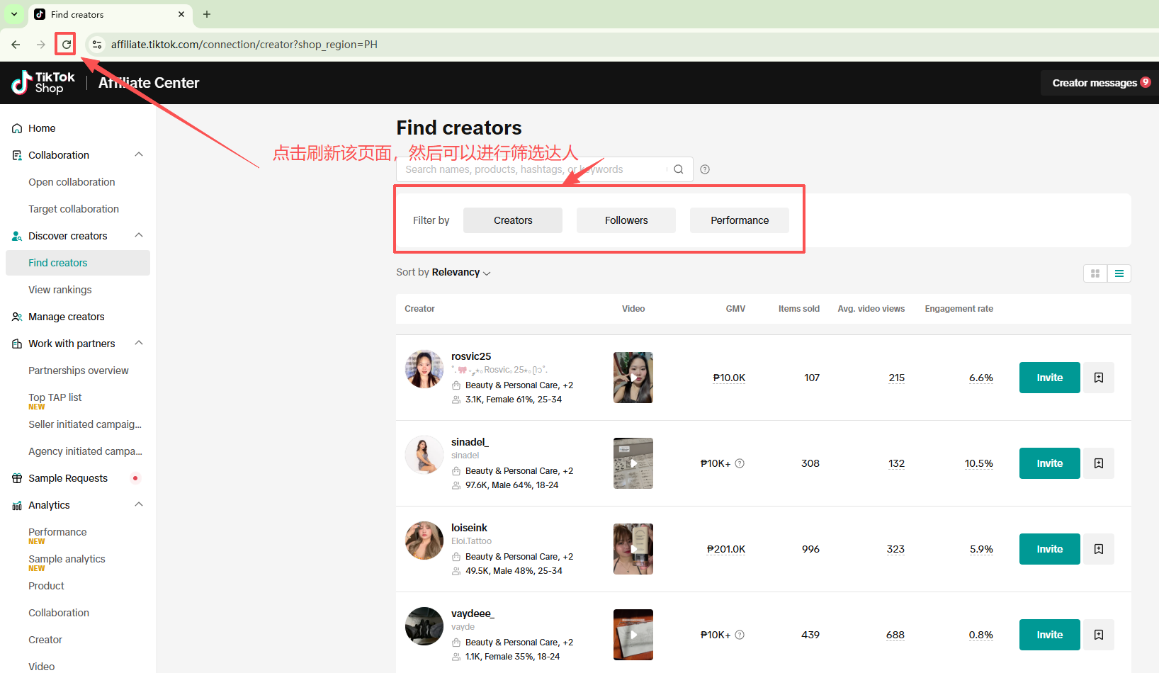 # 打开店铺来到创作者市场,刷新页面,可以对达人进行筛选