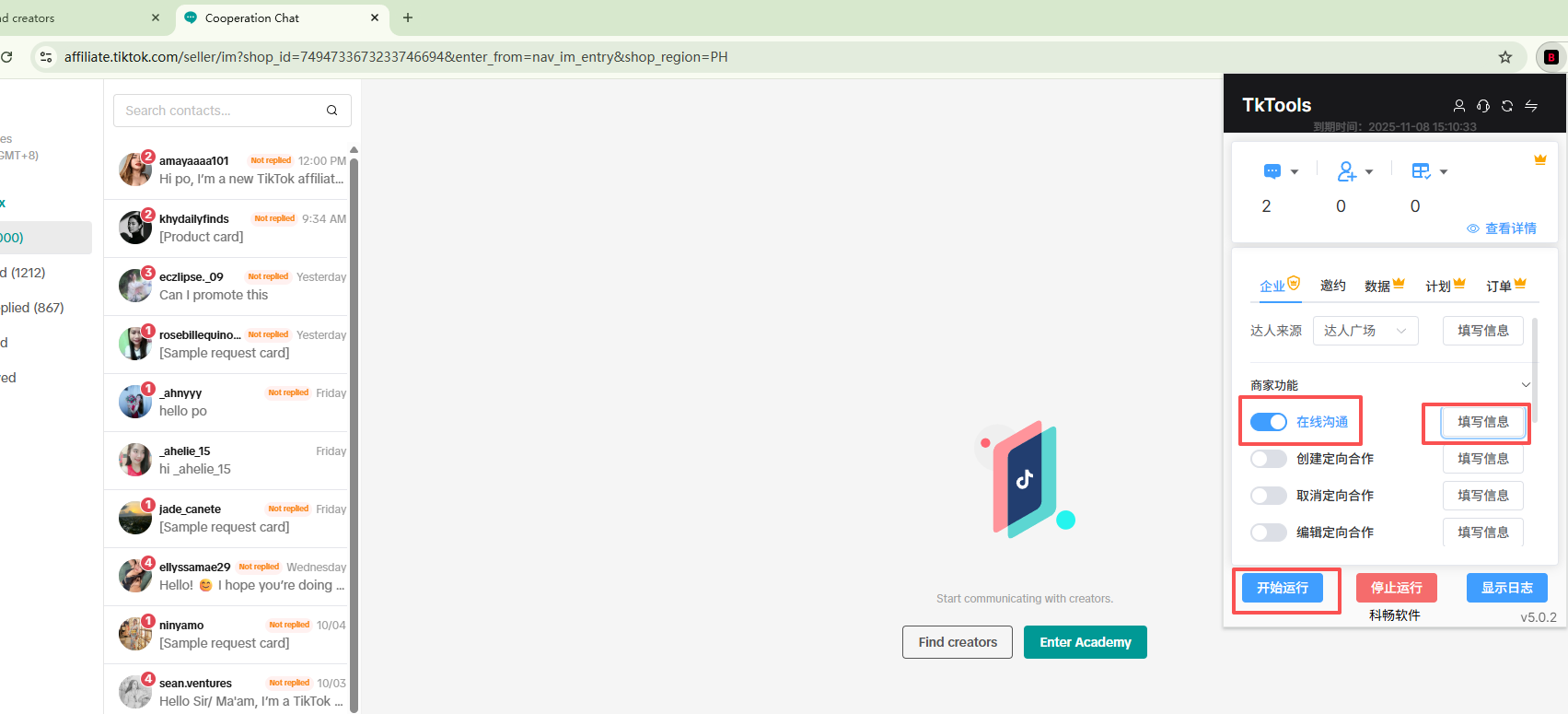 # 打开聊天窗口,开启在线沟通功能并填写,然后开始运行即可